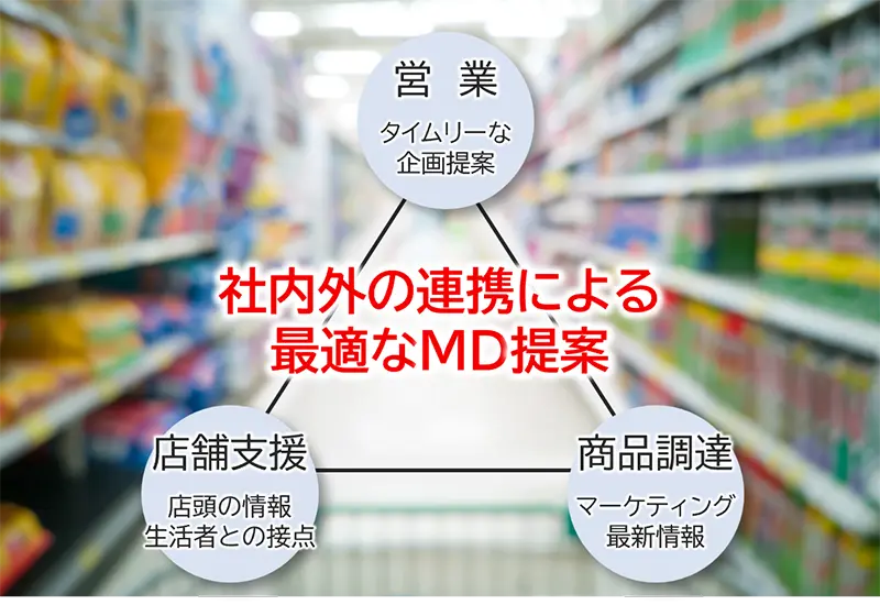 少子高齢化に伴う人口減少や、生活者の価値観が多様化する現代社会において、市場の活性化には、これまで以上に「個」に焦点を当てた高度なマーケティングの必要性が増しています。生活者のニーズが激変する環境下では、前例どおりのMDが通用しなくなっており、効果的なMD提案を行うためには、タイムリーかつ、より多くの情報収集と取捨選択が必要になります。社内外の連携によって、生活者との接点である店頭の情報や市場全体を見渡したマーケティング情報、そして業界トップのPALTACが持つ膨大なデータを活かして、生活者のニーズを満たす鮮度の高いMD提案を実現しています。