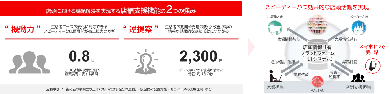 人手不足の影響により、小売業さまの店舗においては販売企画の店頭実現率の低下や販促物の未設置などによる「販売機会の損失」が発生しています。PALTACは、約250名からなる店舗支援専門の部署を持ち、スピーディーな店頭実現を可能にする「機動力」と、店舗活動を通じて得た「現場の活きた情報を効果的な商談につなげる逆提案」機能を活かして、小売業さまとともに生活者にとって魅力的な店頭の実現に取り組んでいます。店舗作業の進捗状況や売れ行き情報などを小売業さま・メーカーさま・PALTACの3者で共有できる情報連携プラットフォーム「PITシステム」を構築しています。これまで把握しきれなかった詳細な店頭状況(売場状況・販促物)の有無などをリアルタイムで共有することができ、各店舗の展開状況を踏まえたPOS分析等、より精緻な効果検証が可能となります。精緻な効果検証に基づく販促提案や好事例の水平展開をスピーディーに行うことで、店頭の販売機会の損失を削減し、さらなる売上拡大につなげていきます。