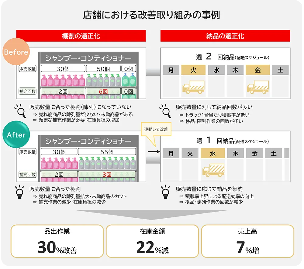 「ムリ・ムダ・ムラ」の解消は、課題の可視化から始まります。まずは、販売・在庫データや店内作業の動画データなど、あらゆる側面からデジタルを駆使して、課題を「見える化」したうえで、仮説・検証を繰り返し無駄な作業を削減していきます。一度の検証で成果が出ない場合もありますが、PALTACが長年培ってきた生産性向上に対する「改善ノウハウ」や、社員それぞれに備わる「やりきる力(GRIT)」といった強みを活かして継続的な改善活動に取り組むことで、効果の最大化を図っています。取り組みにあたっては、お互いのトップ同士が参画し、前向きな姿勢で、広範囲かつ一歩踏み込んだ取り組みを継続することで、小売業さまへの利益貢献、そして信頼獲得による取引関係の強化につなげていきます。