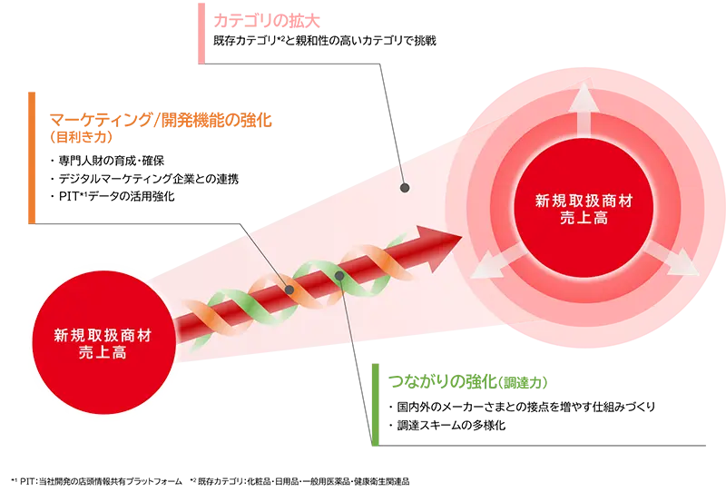 SNSをはじめとする個人の情報発信・収集機会が増加したことで、生活者は手軽に欲しい情報を集めることができるようになりました。これをきっかけに爆発的な需要が生まれる「バズ消費」や個人の好みや体質に合わせた商品を選別する「パーソナライズ消費」など、近年のトレンドは激しく移り変わっています。PALTACはこのような消費トレンドの変化に素早く対応するために、的確な市場分析やマーケティング戦略の立案を担う社内専門人材の育成・確保、SNSの購買行動分析を行うデジタルマーケティング企業との連携、社内の店頭情報システム「PITシステム」に集約された店頭データを活用することで、マーケティング機能を強化し「目利き力」を高めていきます。既存の取り扱いカテゴリと親和性の高いカテゴリで商品の拡充を図ることで、「生活者に彩りを増やし」新たな収益の獲得につなげていきます。