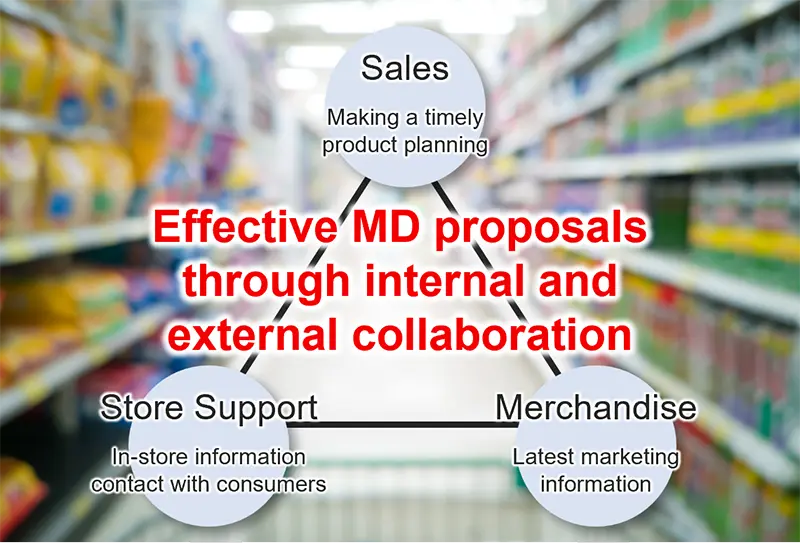 在当今社会,由于出生率下降和人口老龄化,人口正在减少,"sei-katsu-sha "的价值也在多样化,因此越来越需要以个人为中心的复杂营销来振兴市场。在 "西葛社 "的需求发生巨大变化的环境中,"常规 MD "已不再适用,需要及时收集和丢弃更多信息,以便提出有效的 MD 建议。通过内外协作,我们利用与消费者接触的点--车间--的信息和着眼于整个市场的营销信息,以及行业领先企业 PALTAC 所掌握的大量数据,提出满足消费者需求的高新鲜度 MD 提案。