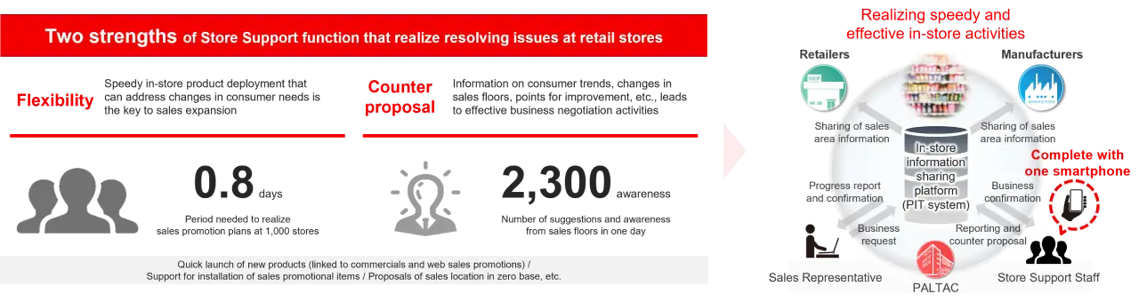 PALTAC 拥有约 250 人的专门店铺支持部门,该部门具有 "机动性",能够快速实现店铺目标,并通过店铺活动获得 "来自一线的有效信息"。PALTAC 利用其 "机动性 "迅速实现店面,并利用其 "反向提案 "功能,将店面活动中获得的有效信息与有效的商务谈判联系起来,与零售商合作,为消费者打造极具吸引力的店面。我们建立了一个信息协作平台--PIT 系统,使零售商、制造商和 PALTAC 能够共享店铺运营进度、销售和其他信息。这样就能实时共享迄今为止无法全面掌握的店铺状况(销售现场状况、促销项目)的详细信息,并能根据各店铺的发展状况进行 POS 分析等更精确的效果验证。该系统根据精确的效果验证迅速提出促销建议,并横向部署良好做法,从而减少店铺销售机会的损失,进一步扩大销售。