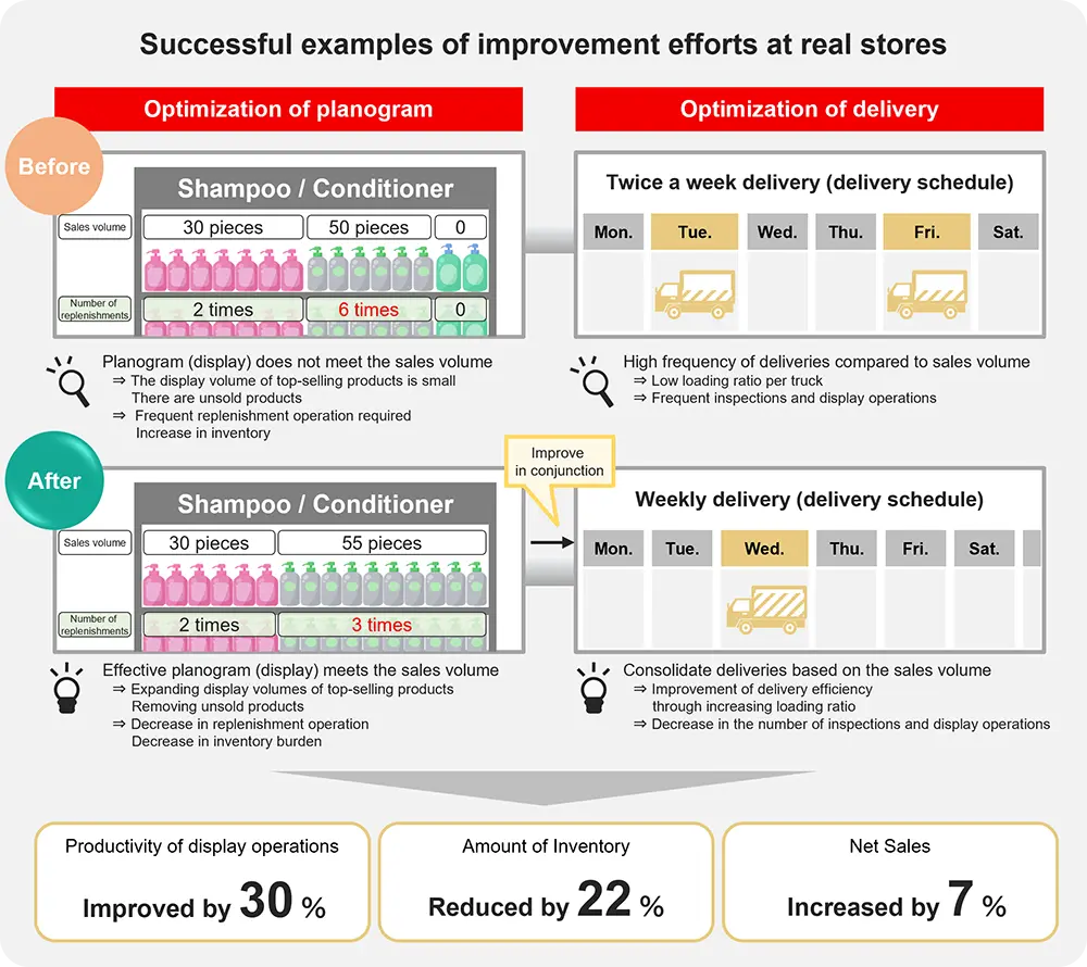 消除 "muri、muda 和 mura "首先要将问题可视化。首先,充分利用各方面的数字数据,包括销售和库存数据以及店内运营的视频数据,将问题可视化,然后通过反复假设和验证,减少不必要的工作。虽然不一定在一次验证后就能取得成果,但 PALTAC 通过发挥多年积累的优势,如提高生产率的诀窍和员工个人的 GRIT(目标-毅力-诚信),力求将持续改进活动的效果最大化。各公司的高层管理人员都参与到这些活动中来,通过保持积极的态度和广泛、循序渐进的方法,为零售商创造利润,并通过赢得他们的信任来加强业务关系。