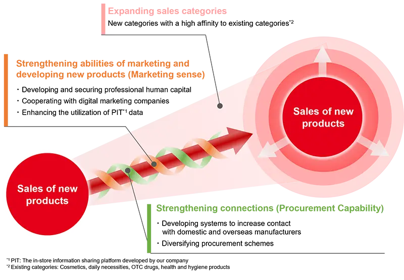 通过社交网络服务等方式,个人传递和收集信息的机会越来越多,这使得消费者更容易收集到他们想要的信息。为了快速应对这些消费趋势的变化,PALTAC 正在培养能够提供准确市场分析和营销策略的内部专家。PALTAC 将通过培养和确保内部专家制定战略,与分析 SNS 购买行为的数字营销公司合作,以及利用内部店内信息系统 PIT 系统收集的店内数据,强化营销功能,提高 "行家 "水平。通过扩大与现有经营品类具有高度亲和力的产品种类,公司将 "为消费者增添更多色彩",并创造新的收入。