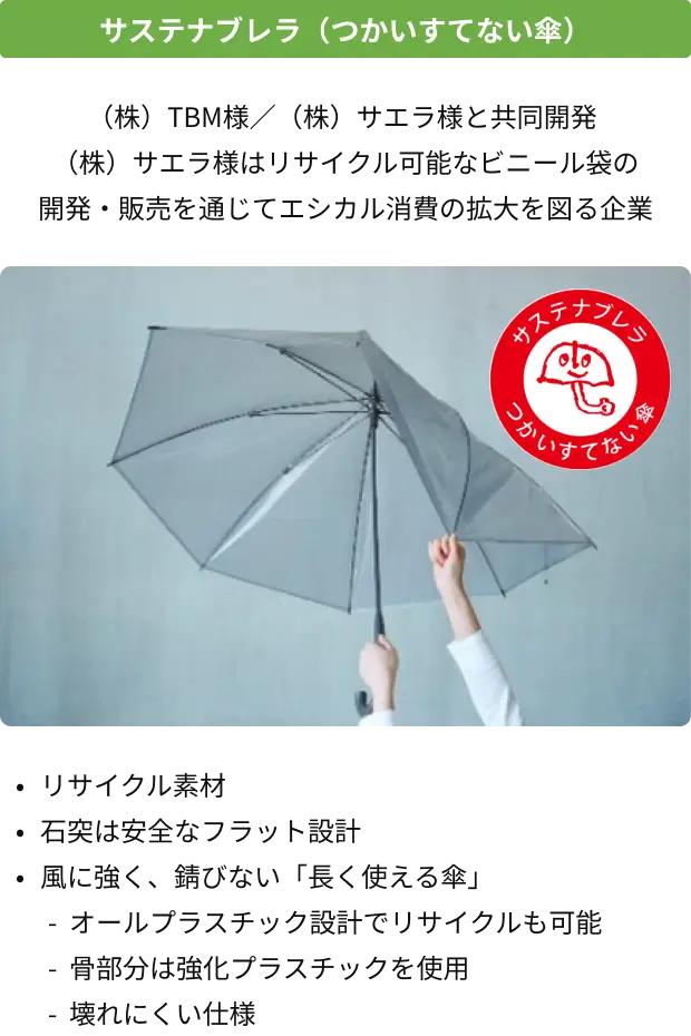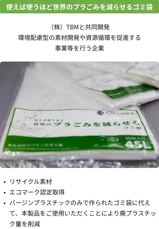 エシカル消費の拡大に向けた新たな取り組みとして、資源循環を促進する素材・商品開発等を行う企業さまと協働で廃棄プラスチックを原材料に使用した環境配慮型商品を開発しました。メーカーさまが手掛ける商品に加え、当社自らも商品開発に携わり、積極的に「生活者のみなさまが身近に環境貢献を実現できる付加価値の高い商品」の流通拡大に貢献していきます。