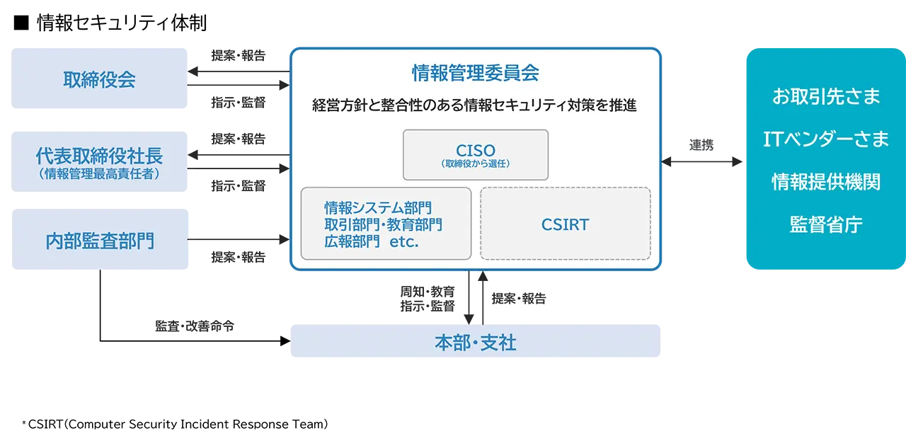 情報管理の基準として「情報管理規則」「情報セキュリティ・ポリシー」を制定しています。また、情報管理の徹底のために、最高情報セキュリティ責任者(取締役から選任)が指揮する情報管理委員会、そして各部署には管理者、担当者を置く社内体制を構築しています。