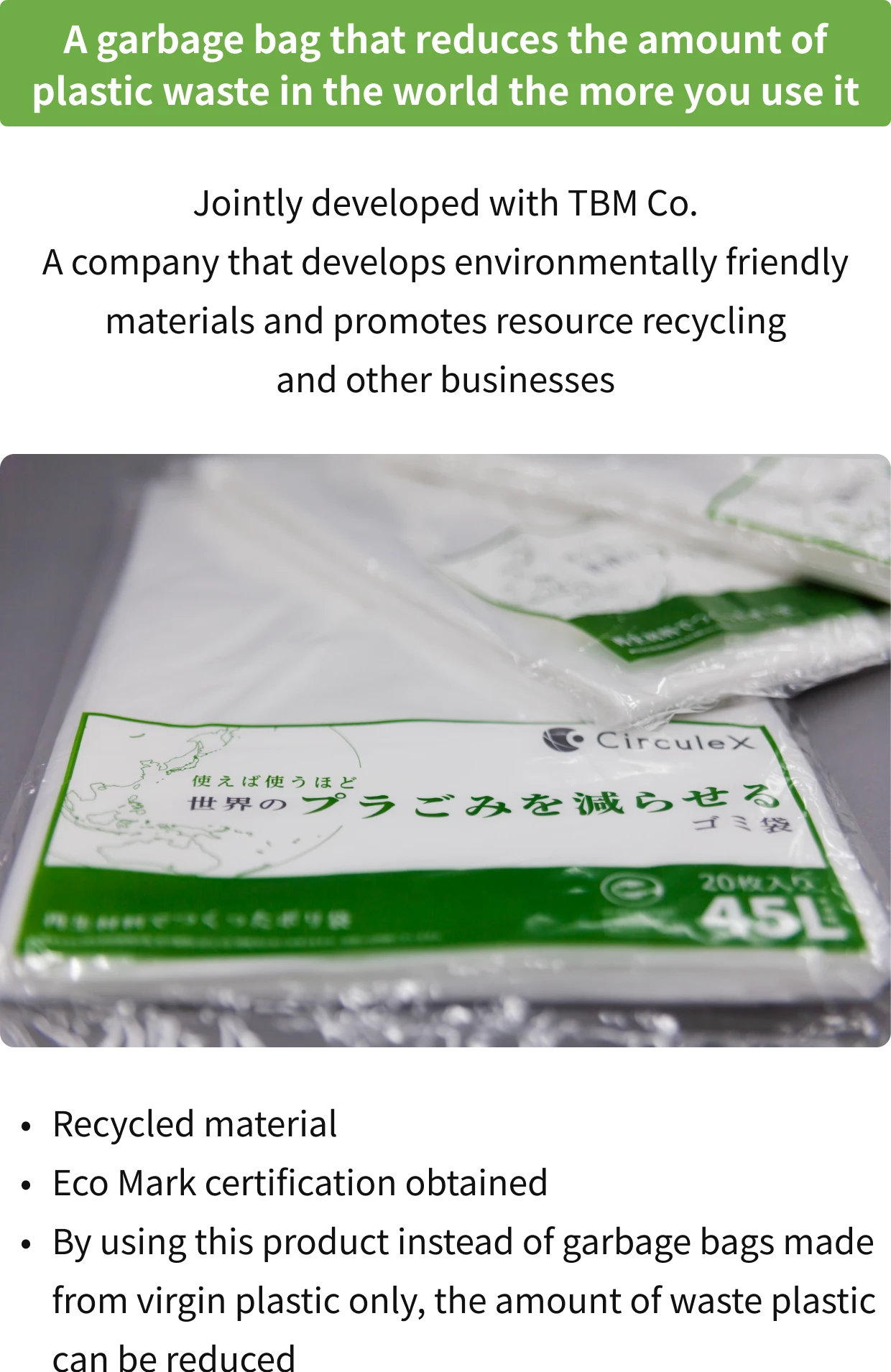 作為擴大道德消費的新舉措,我們與開發材料和產品的公司合作,開發了以廢塑料為原料的環保產品,促進資源回收利用。除了製造商開發的產品外,我們自己也參與了產品開發,並積極為擴大"讓消費者在日常生活中為環境做出貢獻的高附加價值產品"的銷售做貢獻。